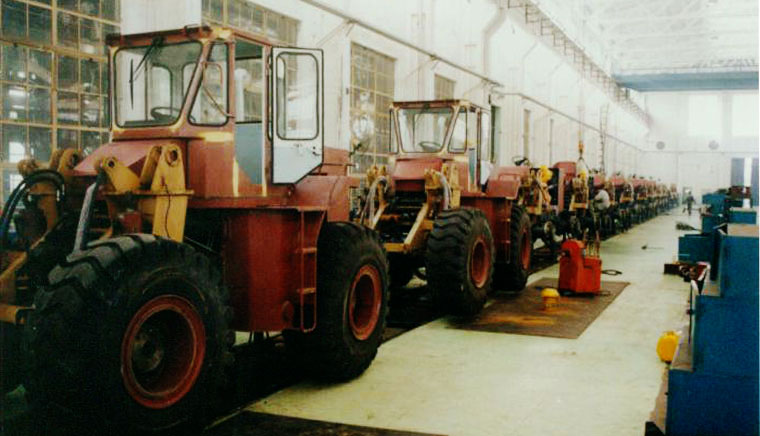 上世纪8、90年代的装载机装配流水线。